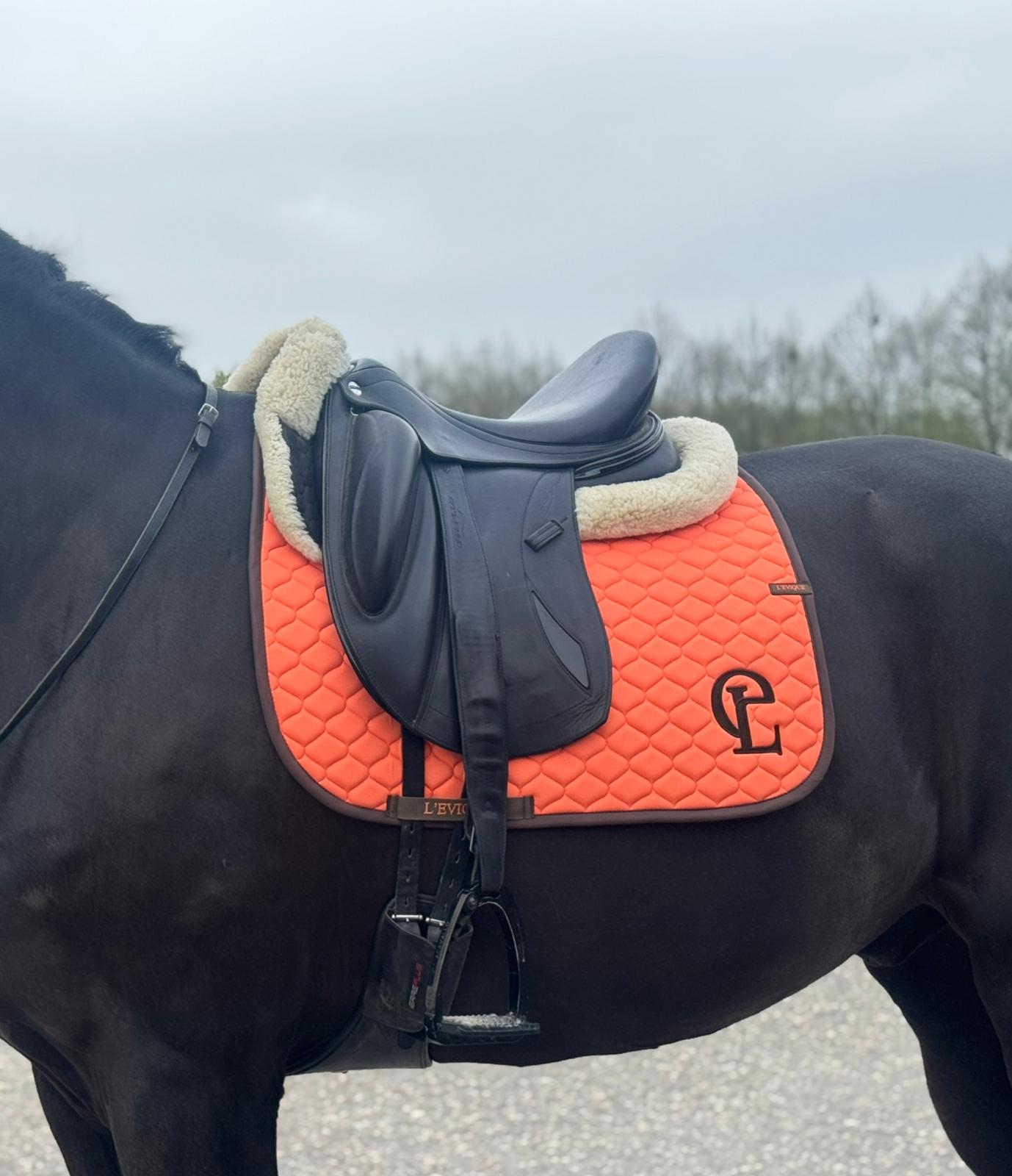 Dressuur zadeldek, in de kleur oranje en afgewerkt met een mooie bruine rand. Het zadeldek is gemaakt van hoogwaardig materiaal en afgewerkt met bruine details zoals het L’Evique logo geborduurd aan 1 zijde.